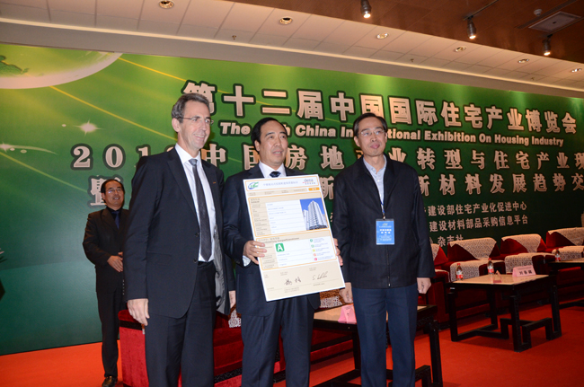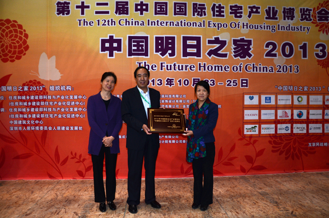住建部科技與產(chǎn)業(yè)化發(fā)展中心文林峰副主任為公司頒發(fā)2013中國國際住宅產(chǎn)業(yè)博覽會(huì)“中國明日之家2013”技術(shù)入選單位 牌匾