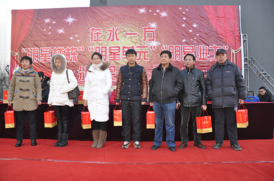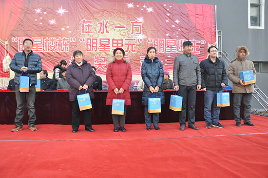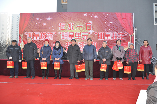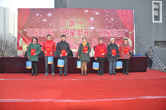 2015年1月9日上午,秦皇島和諧物業(yè)服務(wù)有限公司聯(lián)合在水一方第一社區(qū)居委會(huì)在小區(qū)水系廣場(chǎng)隆重舉行“在水一方小區(qū)第二屆明星樓棟、明星單元、明星業(yè)主”的掛牌及頒獎(jiǎng)儀式。此次評(píng)選歷時(shí)兩個(gè)多月,對(duì)在水一方小區(qū)內(nèi)38棟住宅樓、131個(gè)單元、5295戶進(jìn)行了多輪次的初評(píng)、復(fù)評(píng),終評(píng)定了3棟“明星樓棟”、3個(gè)“明星單元”、135戶“明星業(yè)主”。評(píng)選活動(dòng)的目的是增強(qiáng)在水一方小區(qū)居民的歸屬感、榮譽(yù)感,提高幸福指數(shù)。同時(shí)也為了表彰小區(qū)居民在共同維護(hù)社區(qū)的安全、文明、和諧的生活環(huán)境中所做出的貢獻(xiàn),倡導(dǎo)廣大居民積極主動(dòng)地參與到社區(qū)的各項(xiàng)建設(shè)中來;顒(dòng)得到了五興集團(tuán)貴州紅醬坊酒業(yè)有限公司的大力贊助。