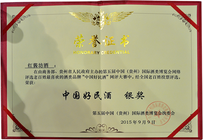 2015年9月9日,貴州紅醬坊酒業(yè)有限公司生產(chǎn)的紅醬坊酒榮獲由國家商務(wù)部、貴州省人民政府聯(lián)合主辦的2015年的第五屆酒博會,“網(wǎng)絡(luò)評選老百姓喜歡的酒類品牌大賽”, “中國好民酒”銀獎。